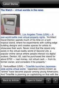 Probably the most exciting feature of this version is the better browsing experience in the ‘Wider Metaverse’ section: there are now news categories, with each virtual worlds news feed falling under one or more of the categories. Aside from making it easier to browse, it also makes adding more sites to the app easier. If you run a blog / news site related to virtual worlds and want to be added, just drop us a line and we’ll assess what we can do for you.