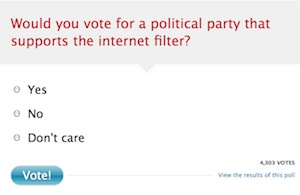 Sorry, this is really for Australian readers only: a large number of Australian media sites are running a common poll on the proposed internet filter. Sure, it’s a very simple question, and there’ll no doubt be some debate over its wording, but it really has one intention: to get a idea of wider community perceptions of the issue. The majority of the tech community are arguably against the filter, but it goes without saying that’s a specialised cohort of people.