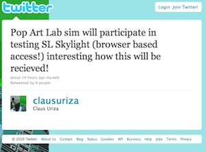 “Project Skylight” is its name apparently, and it’s the project that will hopefully deliver Second Life in a web browser. Tateru Nino got a confirmation from Linden Lab that testing will be occurring, so hopefully we’ll see some concrete examples in the short-term.