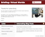 Just a quick heads-up to our infrequent / casual readers that the latest quarterly briefing is now available. You can view it here or sign up to receive them automatically via email each quarter. For the dedicated virtual worlds observer the briefings may not have much new but the feedback we get is overwhelmingly positive from those who have a more fleeting grasp of issues in the field.