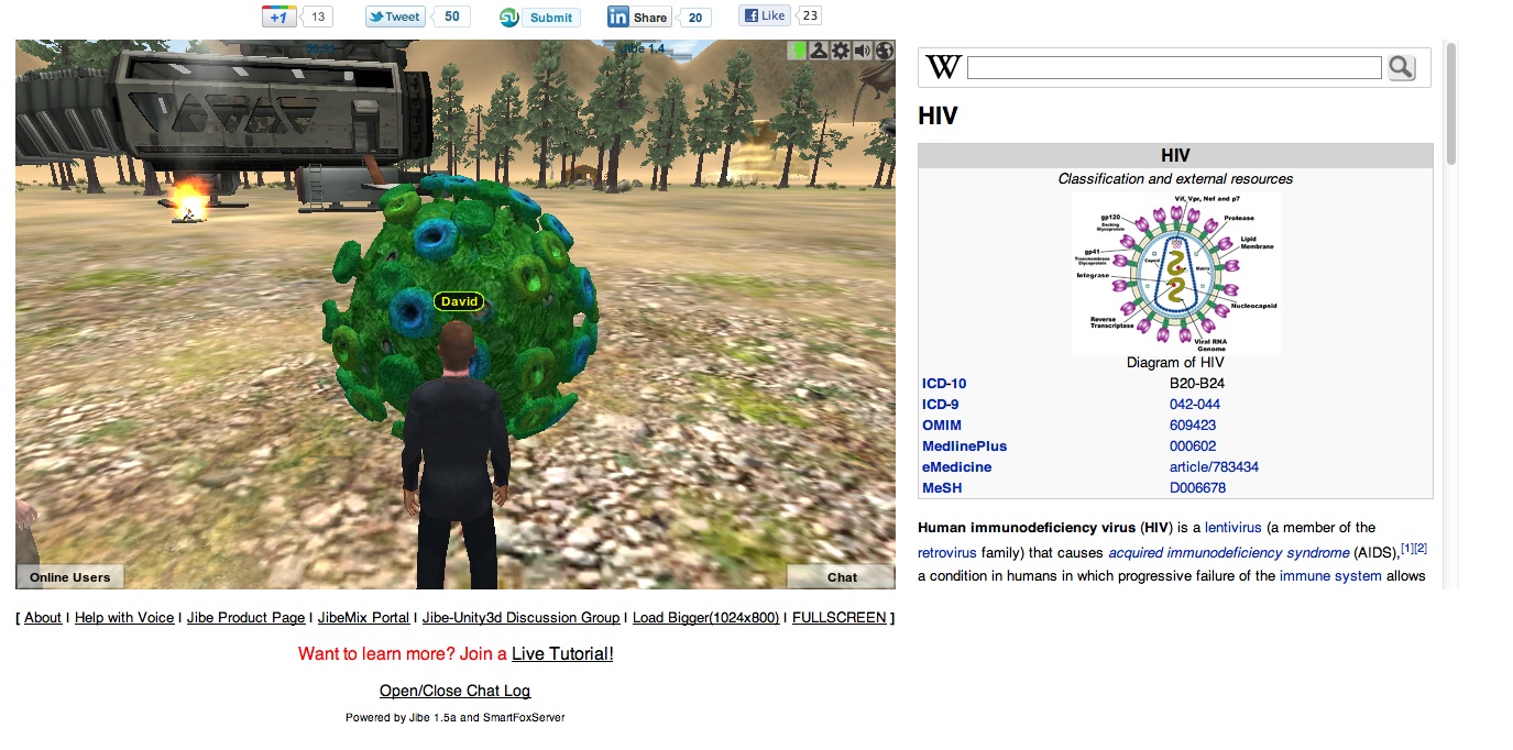 What you’re seeing here is my avatar standing in front of a model of a virus. In this case it’s the Human Immunodeficiency Virus (HIV). I can rotate the virus, check out all it’s aspects and when clicking on it, related information (in this case simple Wikipedia entry on HIV) opens in the same browser window I’m using. Obviously it doesn’t have to be Wikipedia – the sky’s the limit. Above the Unity window are a bunch of social media buttons allowing you to share information you’re interacting with.