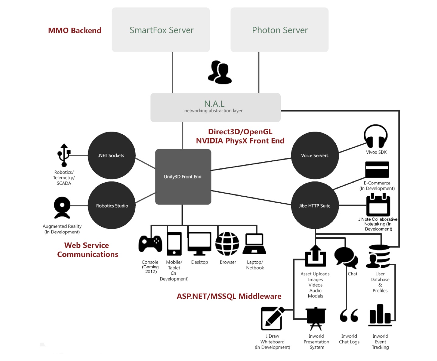 The Jibe platform is an extensible architecture that uses a middleware abstraction layer to communicate with multiple backend systems (currently SmartFox & Photon) and frontends (currently Unity3D)