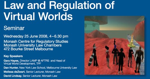 Melbourne keeps on churning out interesting virtual worlds events. This time it’s a seminar titled “Law and Regulation of Virtual Worlds”.